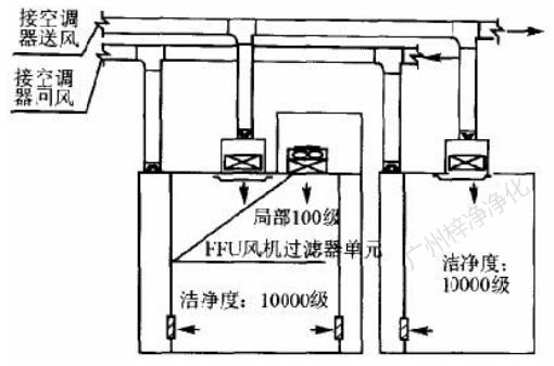 第三種方式,萬級區潔凈房間內含局部百級區。此種情況在藥品生產廠房潔凈區內也比較多見。這種情況,局部百級區面積一般在10m2 以內。可以利用萬級凈化空調系統送風控制室內溫、濕度,補充新風。在局部百級區加大循環風量。循環風處理方式可以采取前述方式 一,即在局部百級區吊頂內作靜壓箱,百級區范圍內滿布FFU,利用FFU處理循環風,如圖3。循環風處理方式也可采取前述方式二,即在局部 百級區吊頂內作靜壓箱,百級區范圍內滿布高效過濾器,利用循環風機加壓,如圖4。