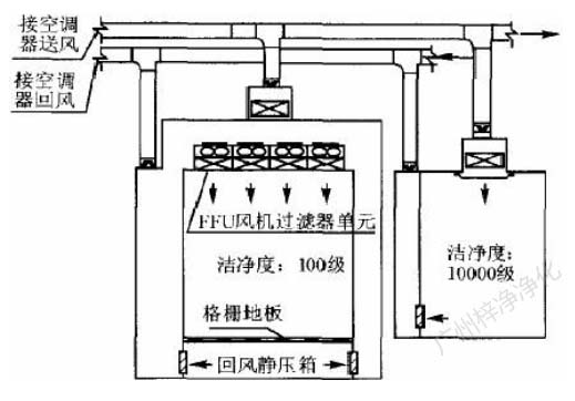 此方式的缺點是設置循環風機箱及處理噪聲,需要較大的空間,而通常百級區周圍風管都比較密集,需要精心布局。此方式百級區上部靜 壓箱相對百級區室內為正壓,頂棚高效過濾器與吊架間的滲漏,為靜壓箱流向室內,直接影響百級區潔凈度。對施工質量要求較高。(具 體可參考: