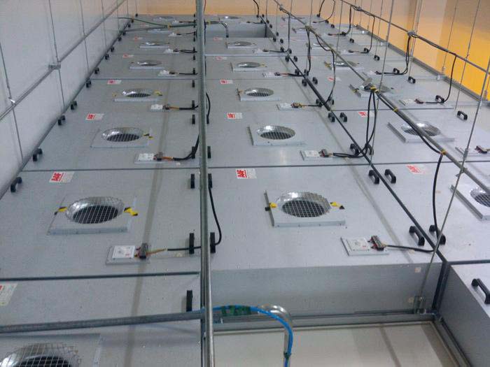 FFU的風機一般為幾臺甚至幾十臺并聯使用,當設計時要考慮FFU噪音的疊加,保證《潔凈室廠房設計規范中明確規定“潔凈室內的噪音級(空態),非單向流潔凈室不應大于60dB,單向流、混合流潔凈室不應大于65dB”的要求。因此在選擇風機時選擇高性能、壓出式、直驅后徑向葉片風機,這樣可以降低整體噪音。潔凈室FFU吊頂