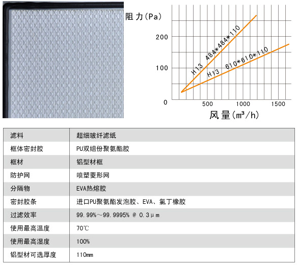 6、過濾效率:H13:99.97-99.99%@0.3μm H14:99.995-99.999%@0.3μm 。