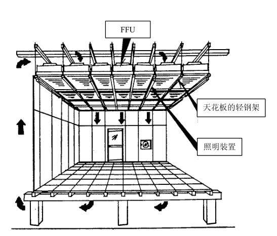 ffu在百級無塵室安裝效果圖,頂部為ffu吊頂凈化龍骨